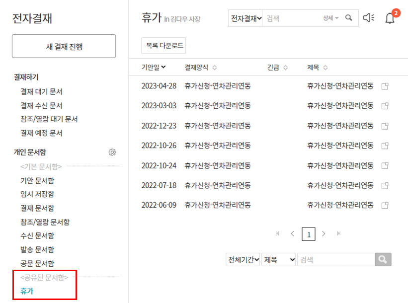 6. 문서함을 공유받은 사용자/부서는 [공유 문서함]에서 해당 문서함 확인 가능