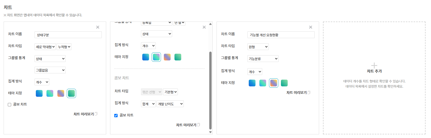 차트 설정과 목록화면 설정은 위 내용과 동일합니다. 📊 차트 설정 🗂️ 목록화면 설정