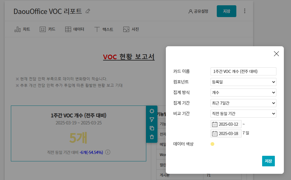 - 설정 : 카드 이름, 컴포넌트, 집계 방식, 집계 기간, 비교 기간, 데이터 색상 설정
