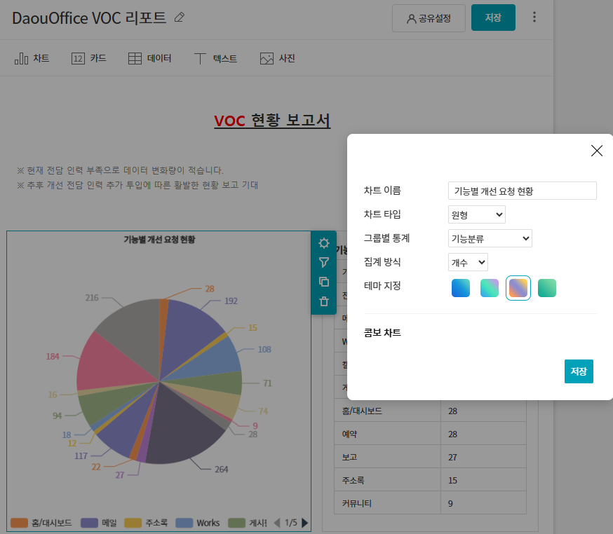 - 테마 지정 : 미리 제공되는 테마를 선택하여 데이터를 일관된 색상으로 표현