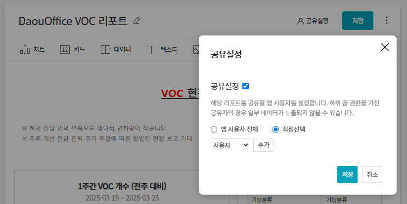 - 공유 설정 : 리포트를 특정 사용자 또는 전체 사용자와 공유 가능