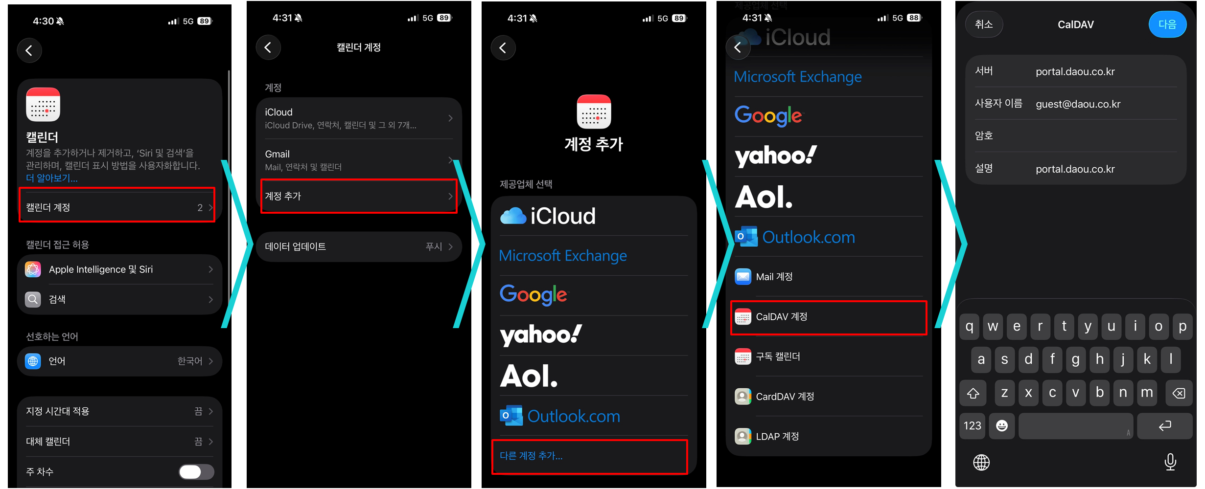 - 🧭아이폰 설정[⚙️] > 앱 > 캘린더/연락처 (입력하여 찾기) > 캘린더 계정 > 계정 추가 > 다른 계정 추가... > CalDAV/CardDAV 계정 추가