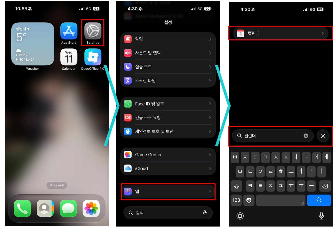 - 🧭다우오피스 앱 > 메뉴(왼쪽 하단) > 설정(⚙️)
