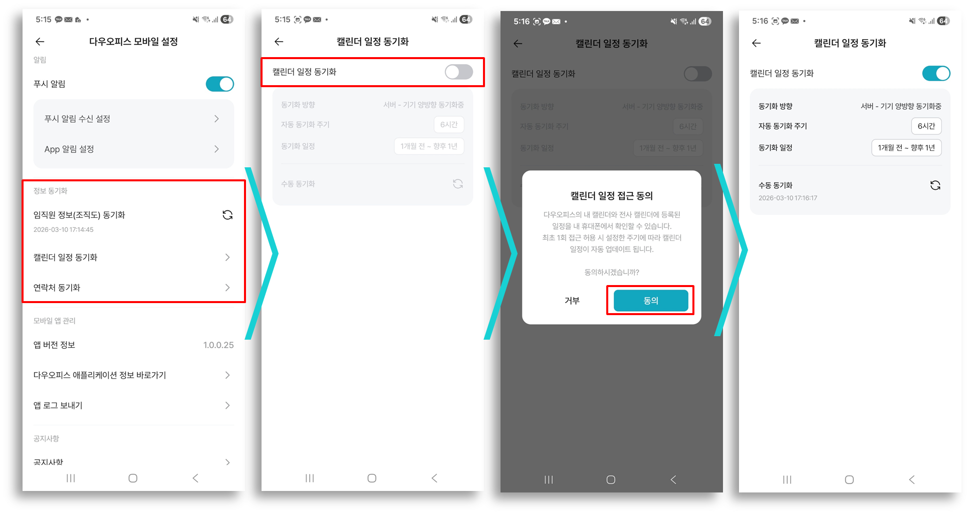 - [정보 동기화]에서 캘린더 일정 동기화 / 연락처 동기화 선택 및 접근 동의