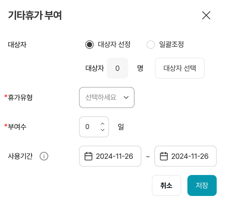 운영자는 개별 또는 일괄 적용을 통해 기타휴가를 부여할 수 있습니다.