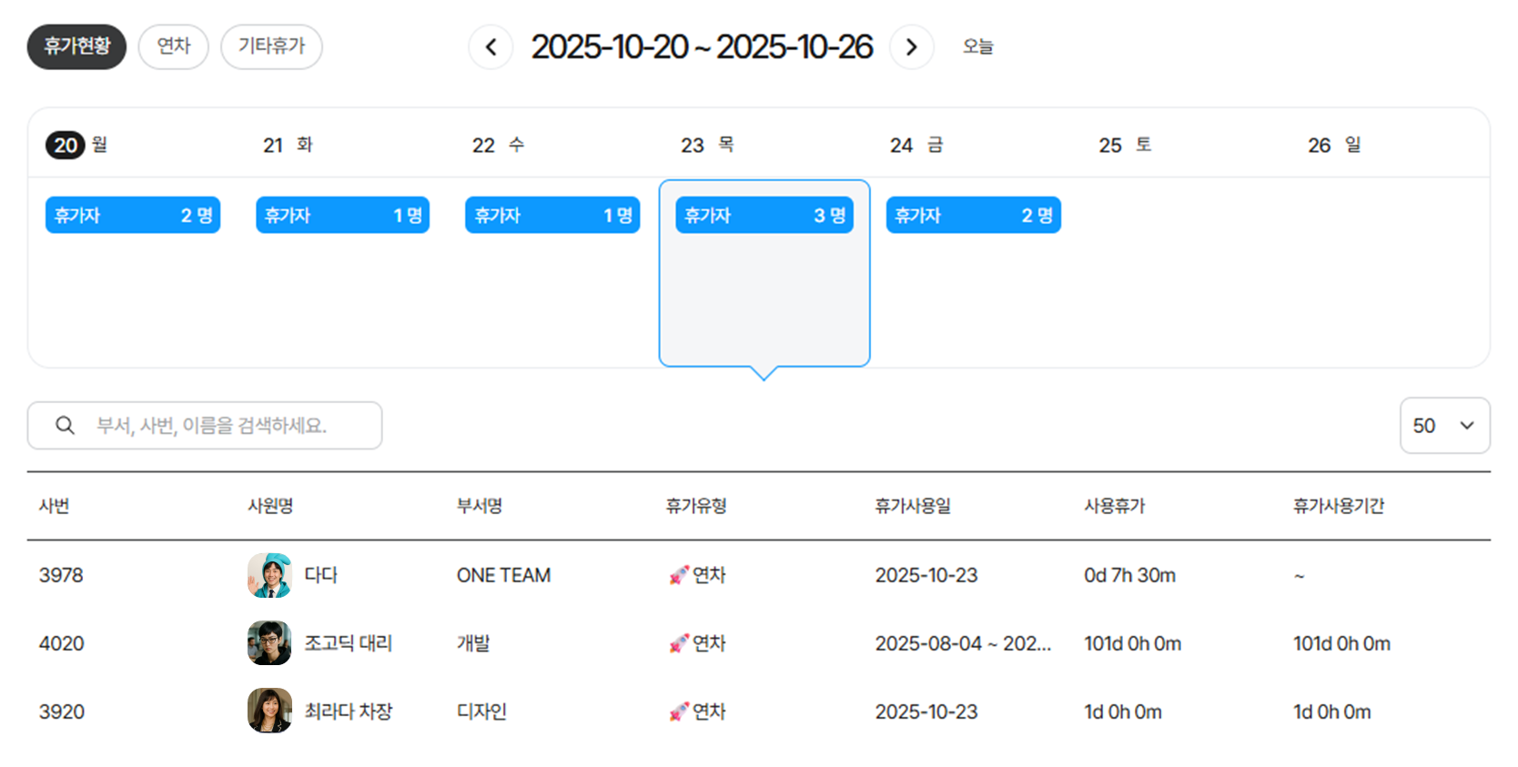 - 연간 기준의 기타휴가 현황과 사원 정보를 통한 프로필 카드 확인 가능
