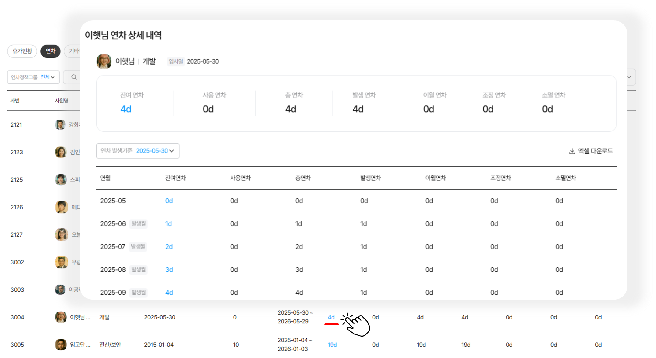 연차현황 목록에서 [잔여연차]를 포함하여 기타 연차 필드를 선택하면 직원의 상세 연차 내역을 팝업을 통해 빠르게 확인할 수 있습니다.