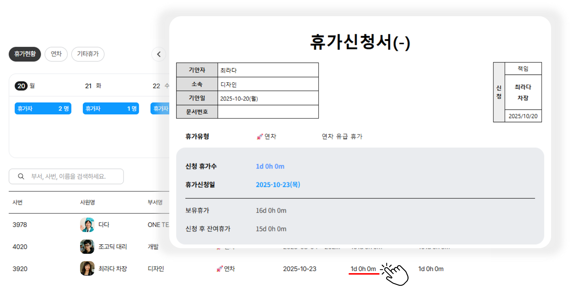 - 휴가 정보(휴가 유형, 사용일, 사용 시간) 클릭 시 상신된 휴가 신청서 상세 조회 가능