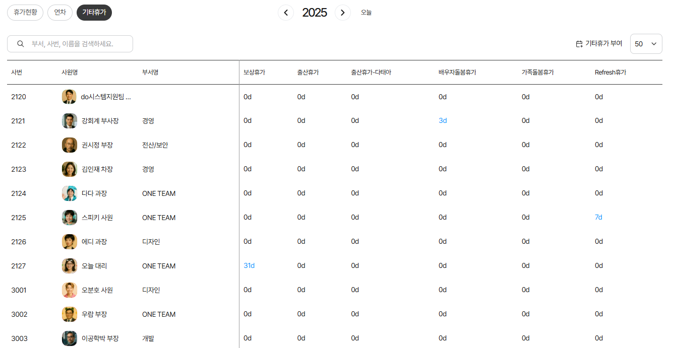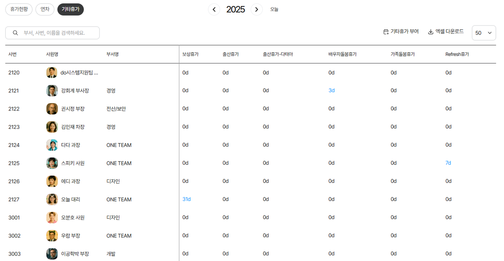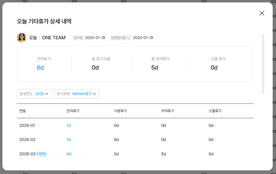 - 총 부여휴가 : 관리자 또는 휴가 신청을 통해 지급된 총 휴가 일수
