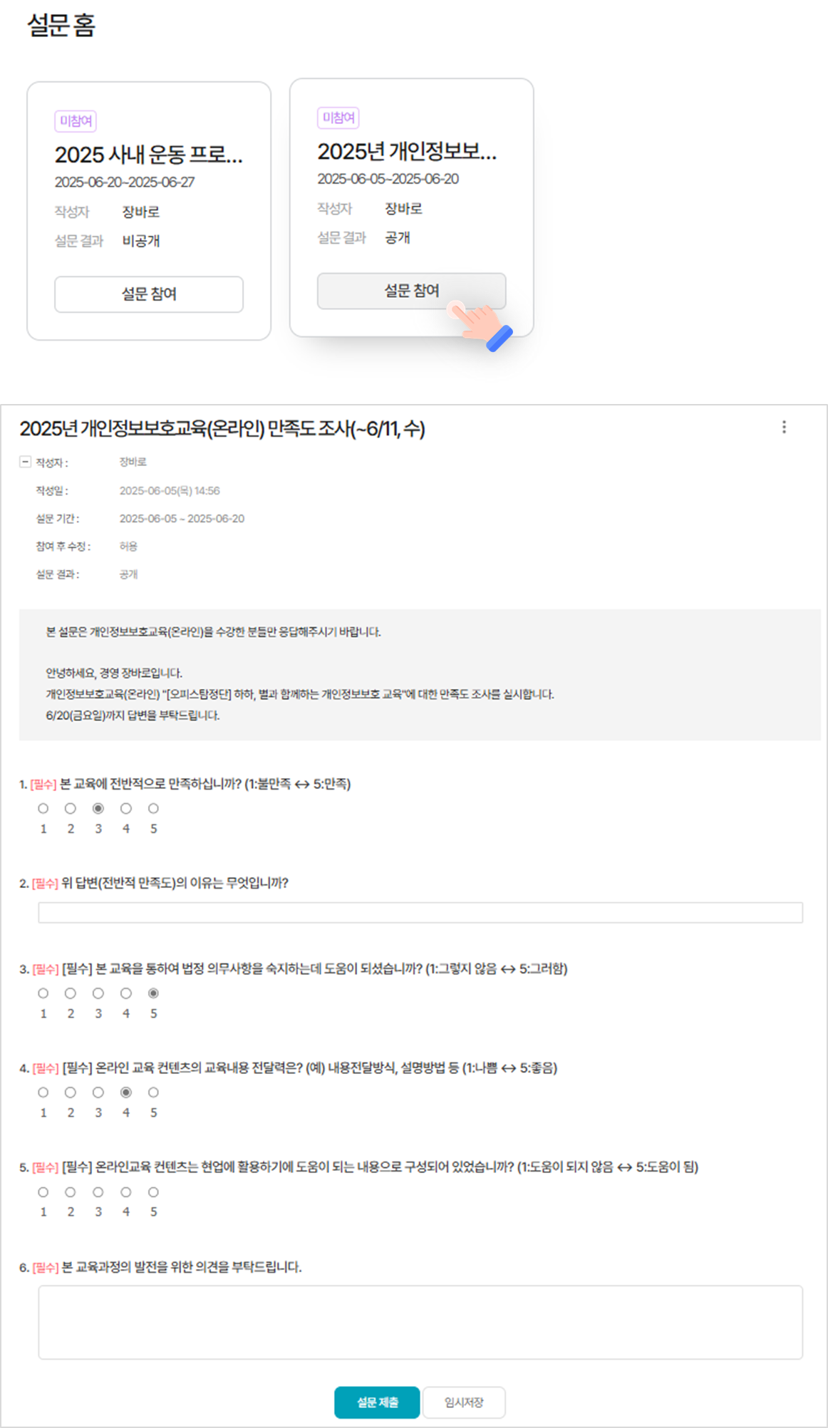 - 설문 App 홈 대시보드에 카드로 노출된 미참여 설문에 [설문 참여] 버튼을 클릭하여 설문에 참여