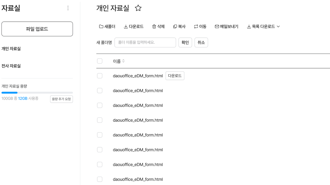 - 자료실 폴더 : 개인 자료실에 만든 폴더와 전사 자료실 폴더, 다른 사람으로부터 공유받은 폴더 목록