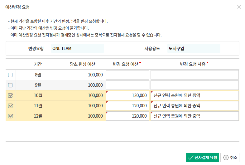 이미 지난 기간의 예산은 변경 요청이 불가능하며, 이미 예산변경 요청 전자결재가 진행중인 예산은 중복으로 결재요청 할 수 없습니다.