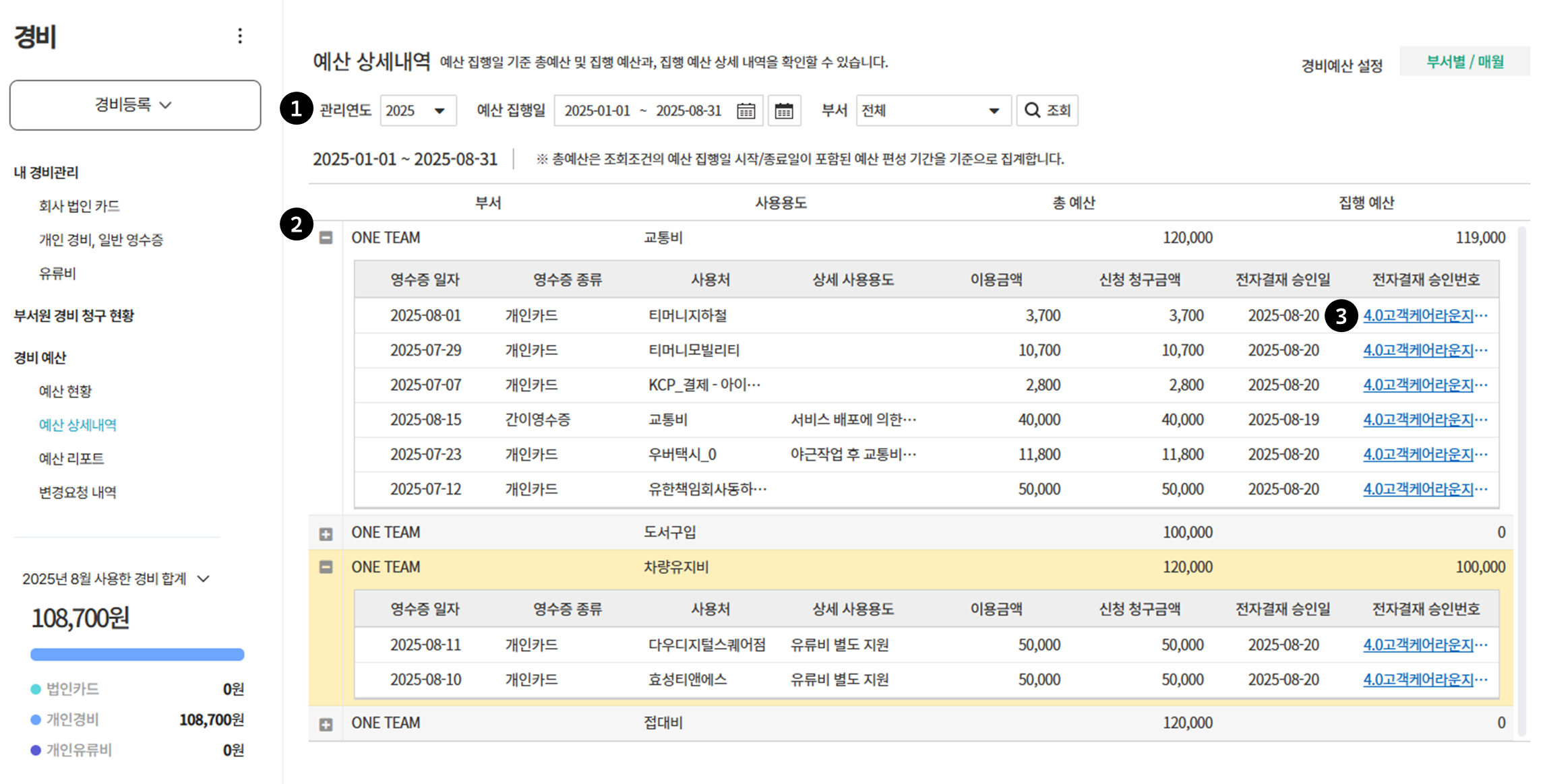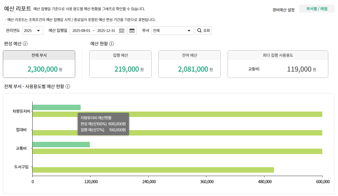 예산 집행일을 기준으로 부서별/사용자별 총 예산 및 집행 예산 상세 내역을 확인할 수 있습니다.