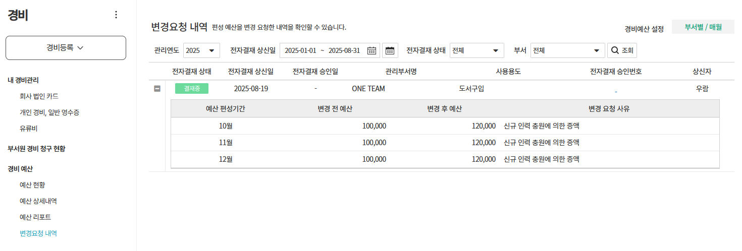 부서별/사원별 경비 예산 현황을 조회하고, 전자결재를 통해 예산 변경을 요청할 수 있습니다.