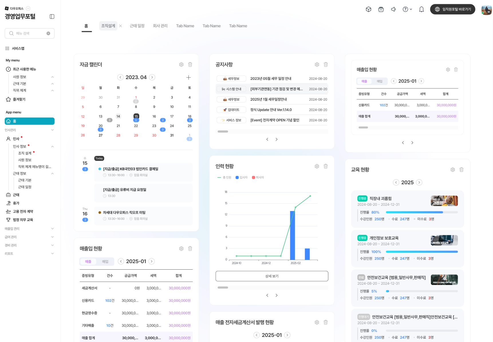 조직도 기반으로 구성된 임직원들은 다우오피스 웹에 로그인하면 가장 먼저 임직원 포털에 접속하게 됩니다. 임직원 포털에서는 개인 일정 관리, 업무 등록, 결재 기안 작성 등 다양한 업무를 처리할 수 있어 효율적인 업무 관리를 지원합니다.