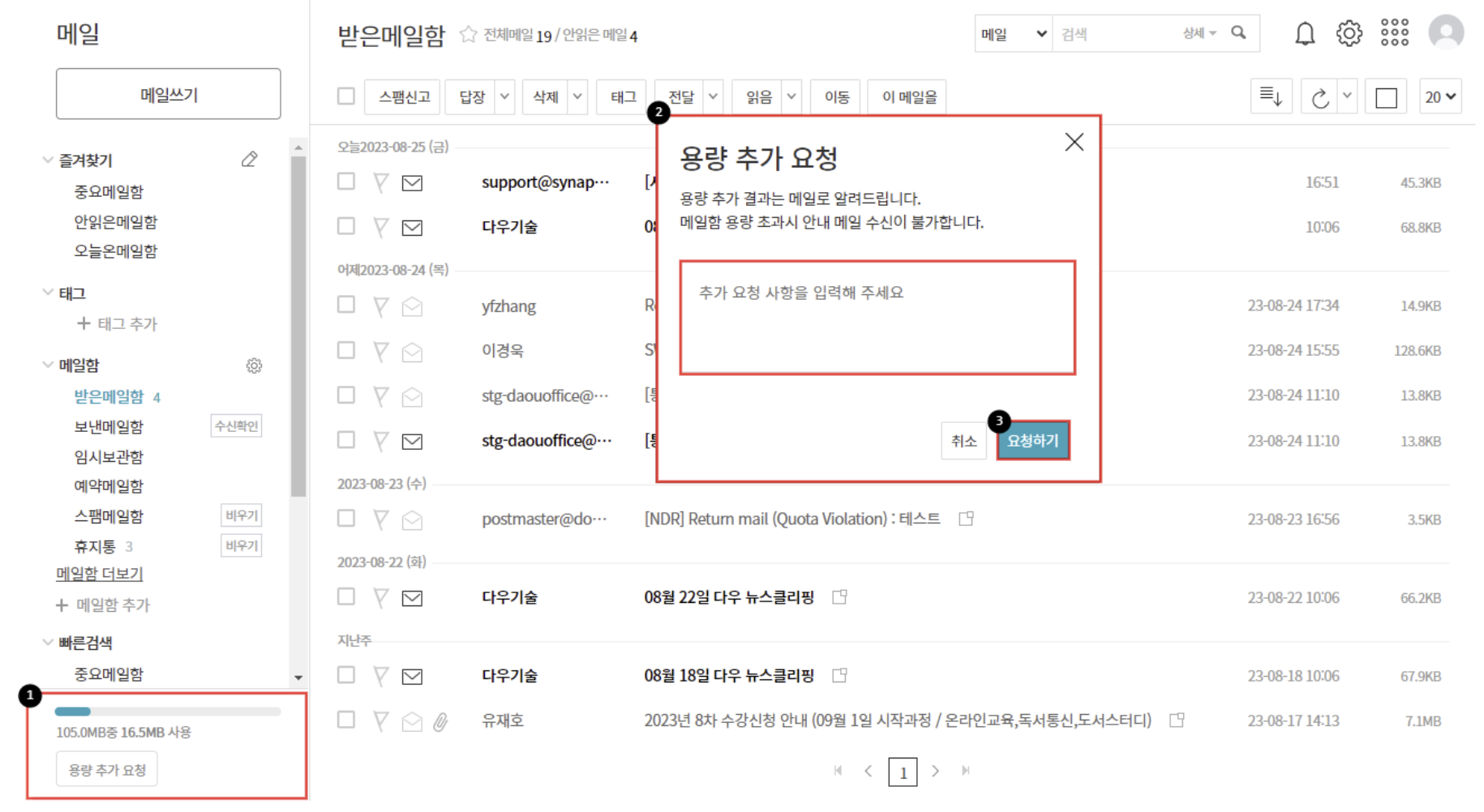 - 🧭임직원 포털 > 메일 App > 왼쪽 사이드바 하단 [용량 추가 요청] 클릭