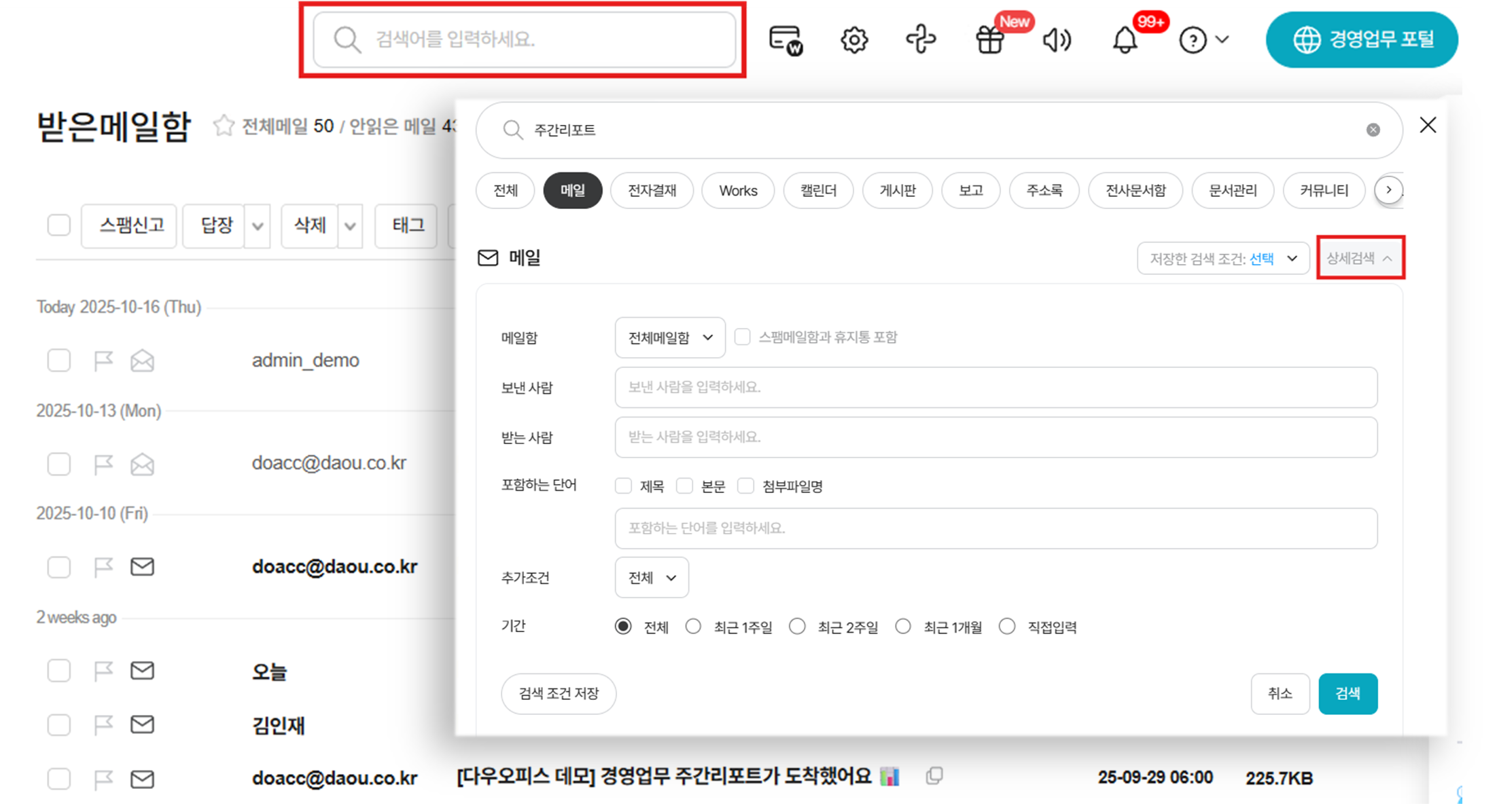 메일함 상단 검색창에 검색 후 [상세건색]버튼을 클릭하거나 아이콘을 클릭하면 모든 메일함 범위에서