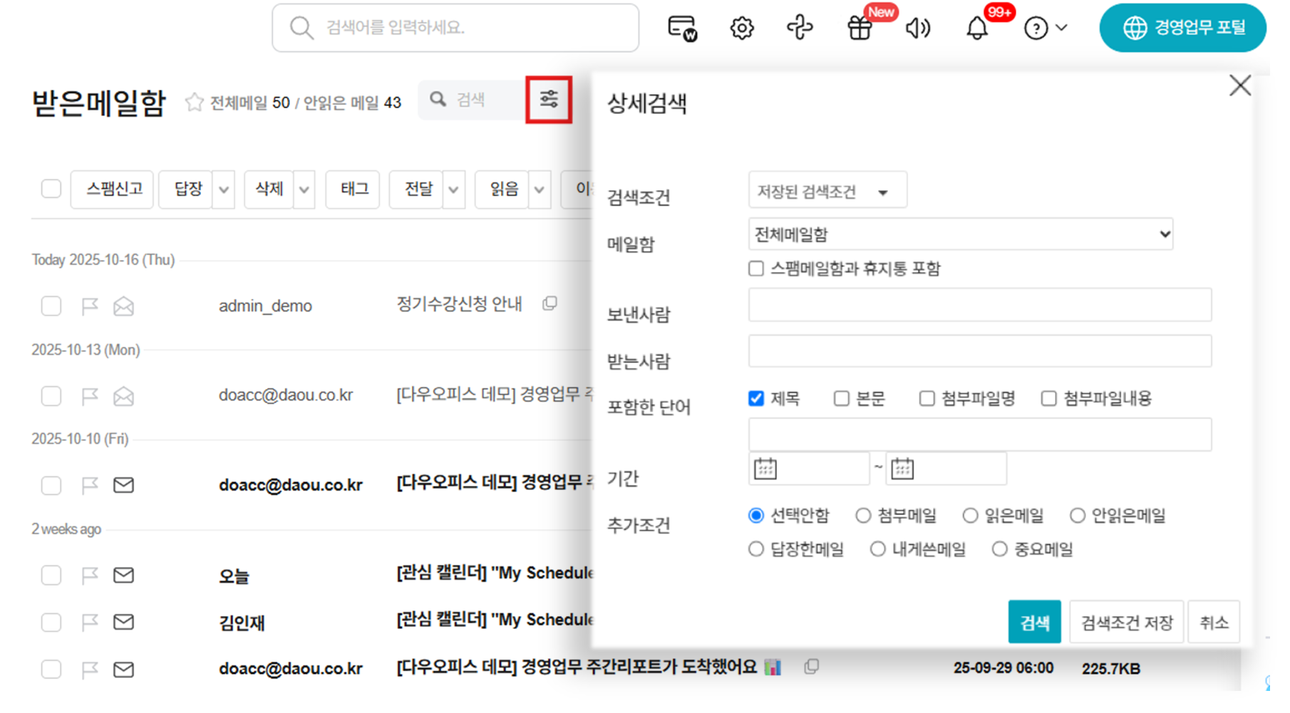 - 선택안함, 첨부메일, 읽은메일, 등 상세 조건으로 필터링 가능