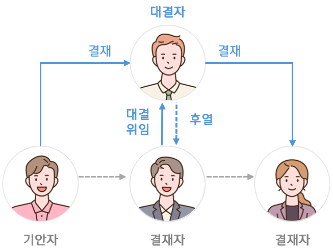 대결자가 결재를 처리했을 경우, 결재선에는 대결자가 결재 처리한 것으로 기록되며, 원 결재자는 결재문서의 결재이력에 후열로 표시됩니다.