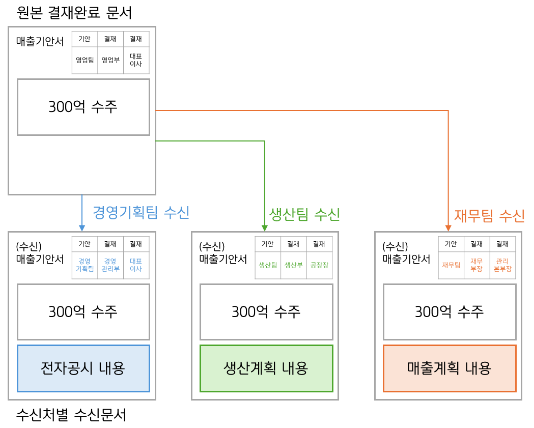 수신 부서마다 결재문서가 복제되어서 전달되어, 수신된 부서별로 결재 처리하여 진행하는 방법 |