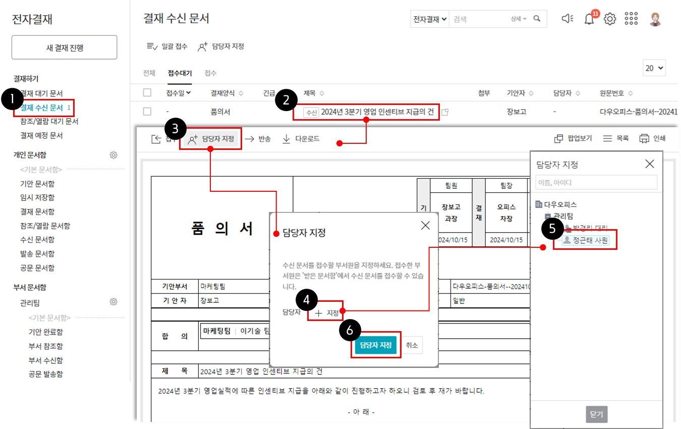 결재문서를 수신한 부서의 부서장은 해당 문서를 처리할 담당자를 지정할 수 있습니다.
