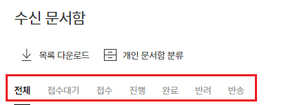혹은 결재 수신 문서함에서 상태별로 문서가 조회되기 때문에, [전체] 또는 [접수] 탭에서 조회해보시기 바랍니다.