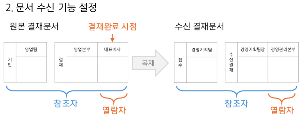 여러 부서와 업무를 공유하고 협조하기 위한 문서 수신 기능은 아래의 2가지 방법으로 사용 가능합니다.