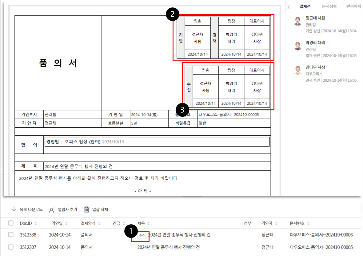 - 전자결재 > 결재 수신 문서 클릭