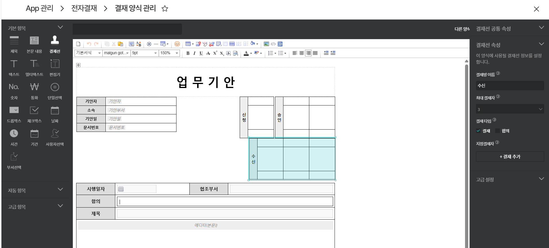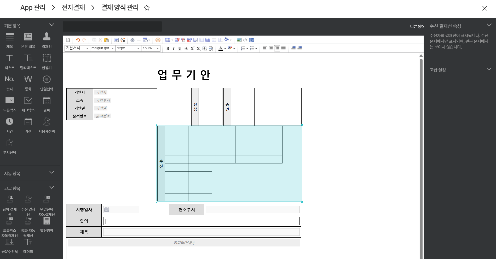 - 양식 편집기 고급 항목 내 [수신 결재선] 클릭