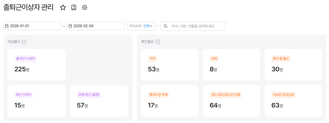 - 근태 이상 상태(누락, 지각, 초과근로 등) 직원 확인