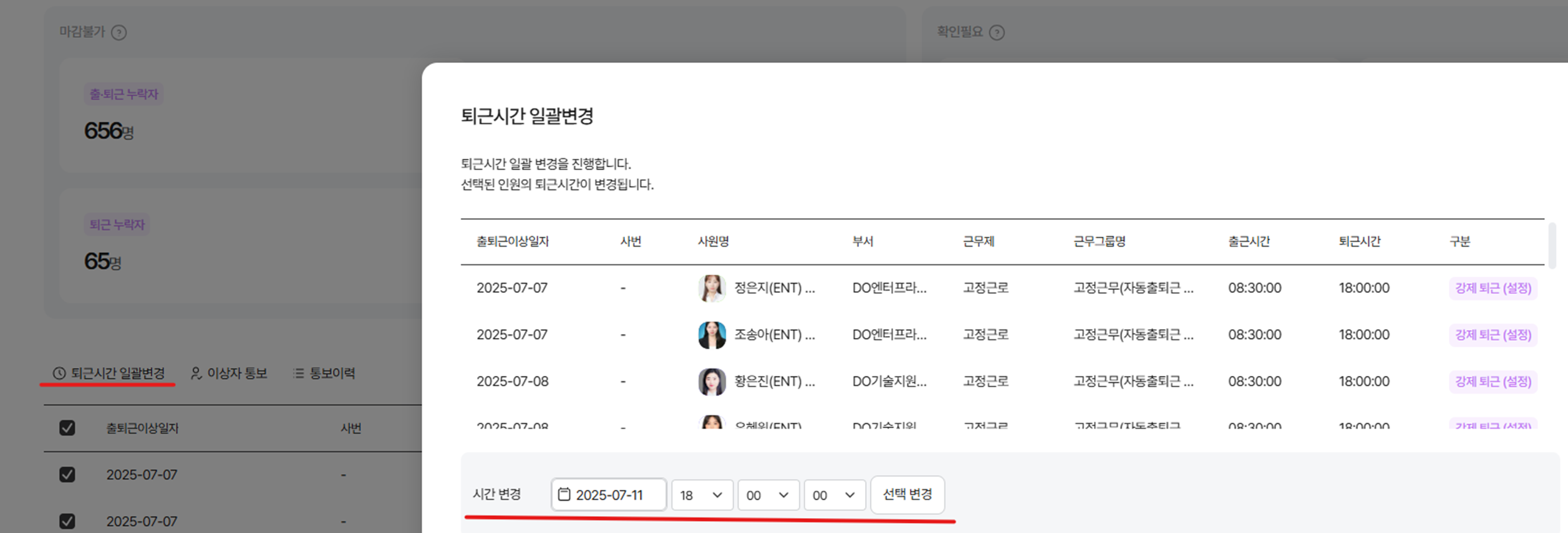 - 출퇴근 누락에 대한 종일 근무상태 변경, 퇴근시간 일괄 변경 가능