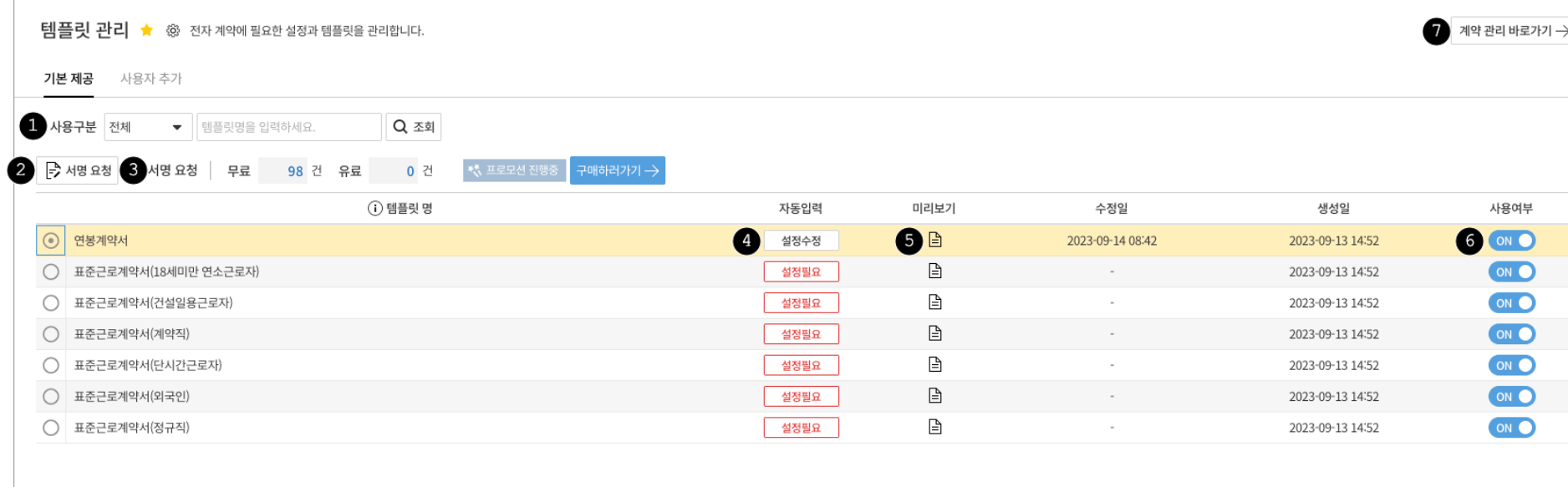 ⑤ 미리보기 : 계약서 서명 요청시 사용될 템플릿 양식 미리보기