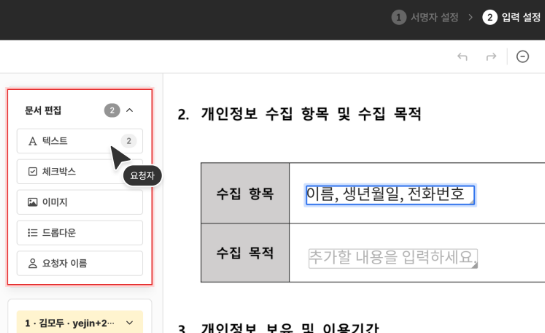 - 서명자들이 '직접' 입력할 텍스트, 사인/도장, 체크박스, 드롭다운 등의 위치를 미리 설정