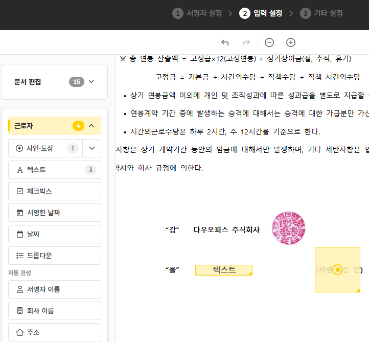 - 좌측에 각 서명자 카드에는 앞서 설정한 '역할'이 기재되어 있으며, 해당 역할의 서명자가 입력할 내용들의 위치를 설정