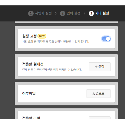 - 템플릿 생성 [3단계 기타설정]에서 '설정 고정' 값을 사용 ON설정 경우 서명요청 불가