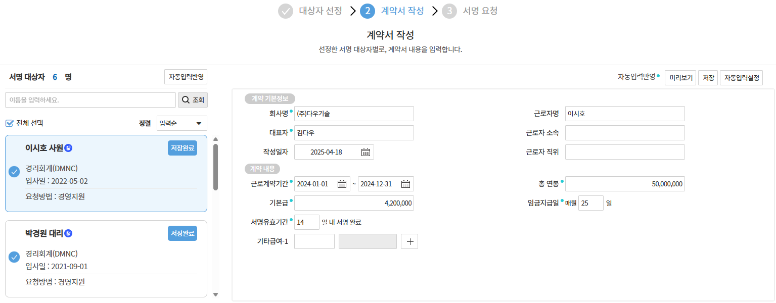 | 엑셀 업로드 | 서명 대상자, 데이터 라벨 기반 계약 항목 |