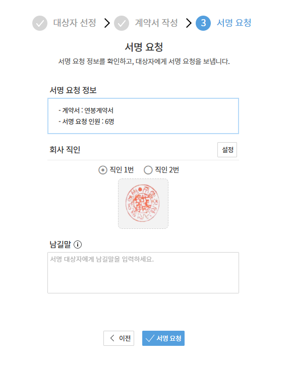 - 직인 선택 및 남길 말 입력 후 [서명 요청] 선택