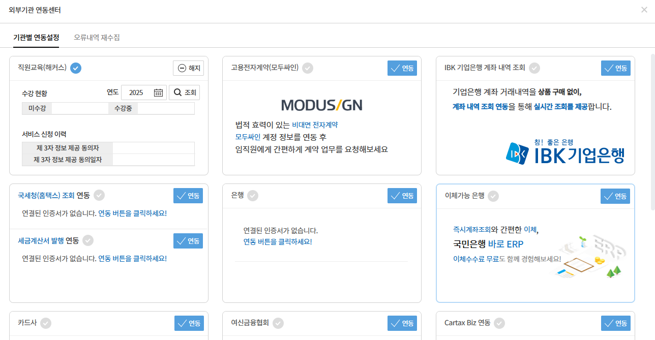 외부기관 연동센터는 국세청(홈택스), 은행, 카드사 등 각종 외부기관의 데이터를 한 곳에서 연결(연동)하고, 연동된 정보를 자동으로 수집·관리하는 메뉴입니다.