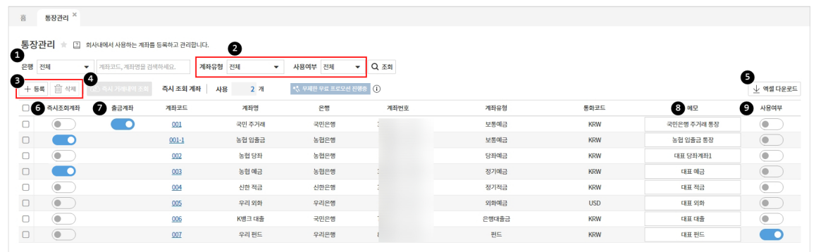 - 계좌 유형(보통예금, 정기예금 등), 사용여부로 필터링 가능