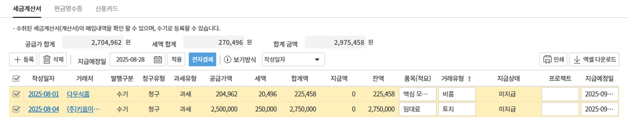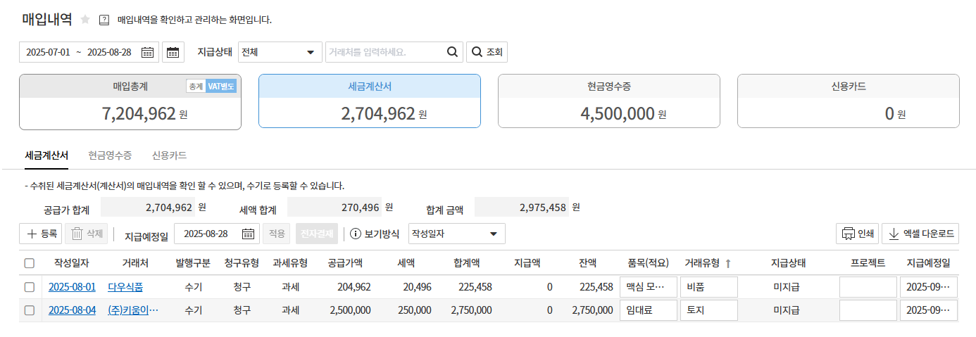 - 매입 내역 > [세금계산서] 또는 [카드/현금영수증] > 지급 상태가 '미지급' 또는 '일부지급'인 항목 체크
