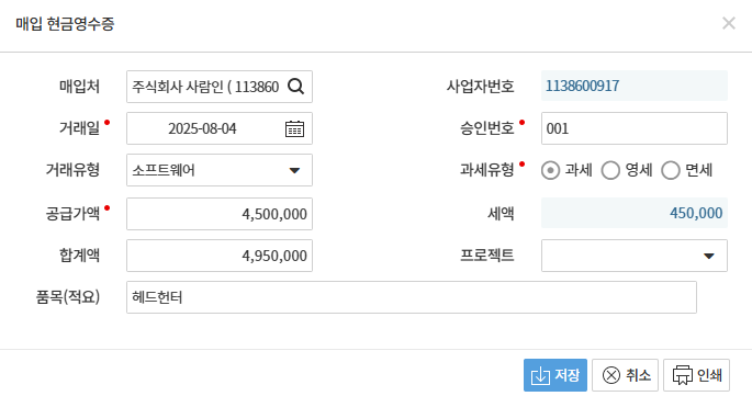 - 품목/적요 : 해당 거래의 품목명 또는 용도 입력 (자동 입력 가능)