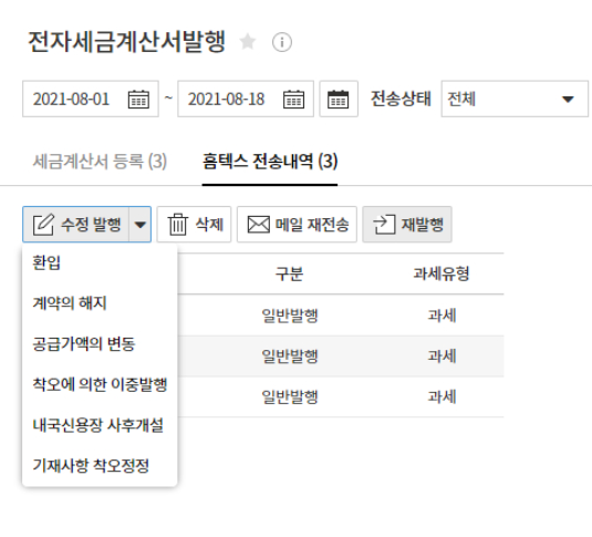 주요 수정 사유 및 발급 방법수정사유 발행방법 환입 처음 공급한 상품이 반품된 경우 → (-) 세금계산서 계약 해지 계약이 파기되어 공급이 안 된 경우 → (-) 세금계산서 공급가액 변동 공급 금액이 변경된 경우 → (+) 또는 (-) 세금계산서 이중 발행 실수로 같은 세금계산서를 두 번 발행한 경우 → (-) 세금계산서 기재사항 착오 정정 거래처 정보, 품목, 금액 등을 잘못 입력한 경우 → (+) 정정 계산서 내국신용장 사후 개설 영세율 적용 사유가 뒤늦게 발생한 경우 → 영세율 세금계산서 - 기존 정보에서 수정사항을 작성 후 [발행] 선택