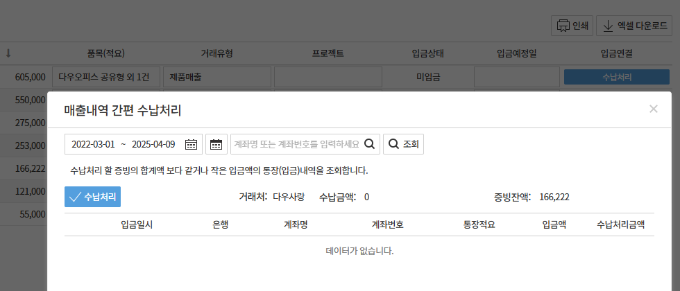 - 일부 입금 : 매출 건별 일부 입금 처리 상태