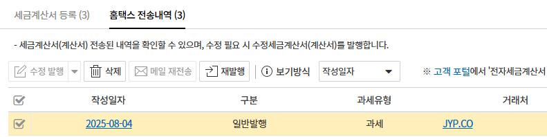 - 전자세금계산서 발행 > [홈택스 전송내역]