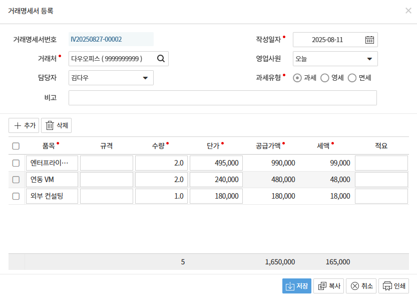 거래명세서는 내부용 증빙 문서로 활용되며, 고객에게 출력해 제공할 수도 있습니다.