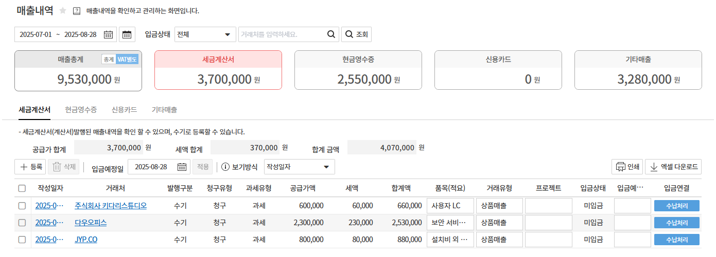 🧭 경영업무 포털 > [매출입] > [매출관리] > [매출내역]은 전자세금계산서뿐 아니라 현금영수증, 신용카드, 기타 매출 등 다양한 매출 유형을 한 곳에서 확인하고, 필요 시 수기 등록하거나 수정·삭제·입금 처리할 수 있는 기능입니다.