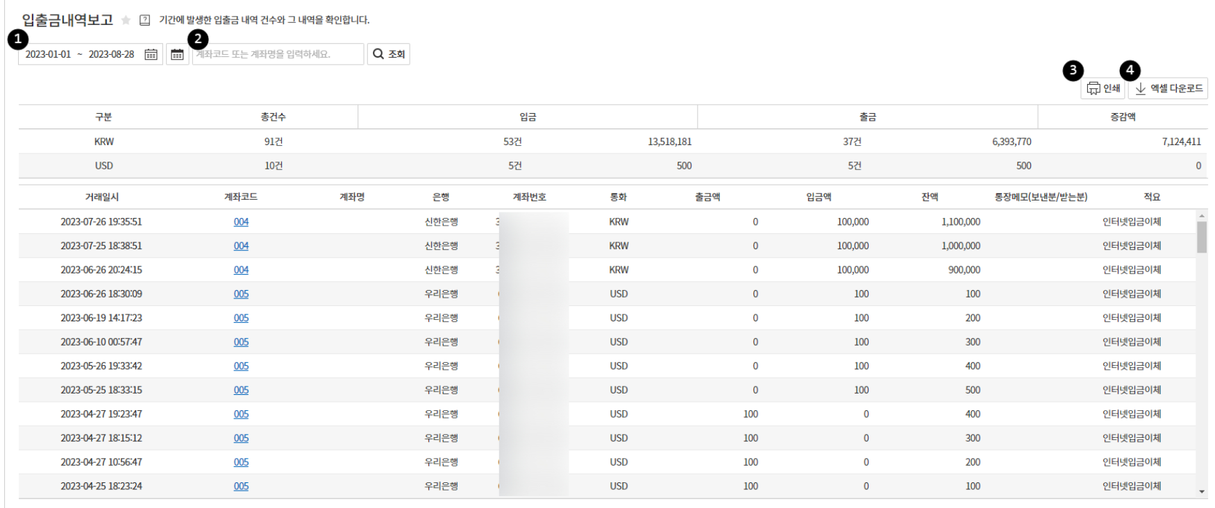 계좌별 입출금 흐름을 추적할 수 있는 기능으로, 계좌 잔액 현황과 입금/출금 내역을 일자별로 정리합니다.