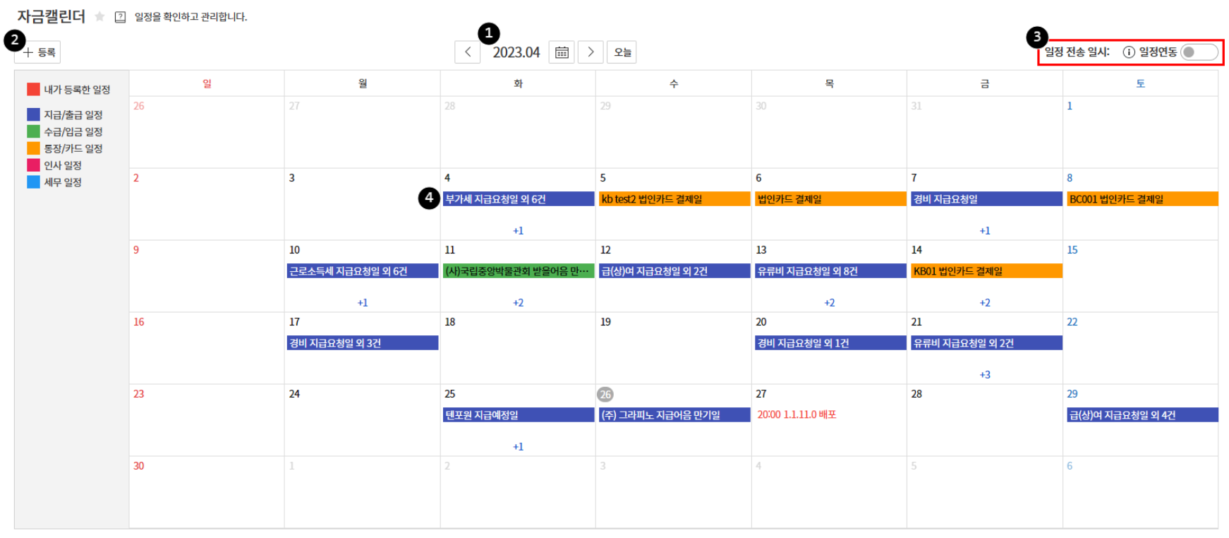 - 지급/출금 일정, 수금/입금 일정, 통장/카드 일정, 인사 일정, 세무 일정
