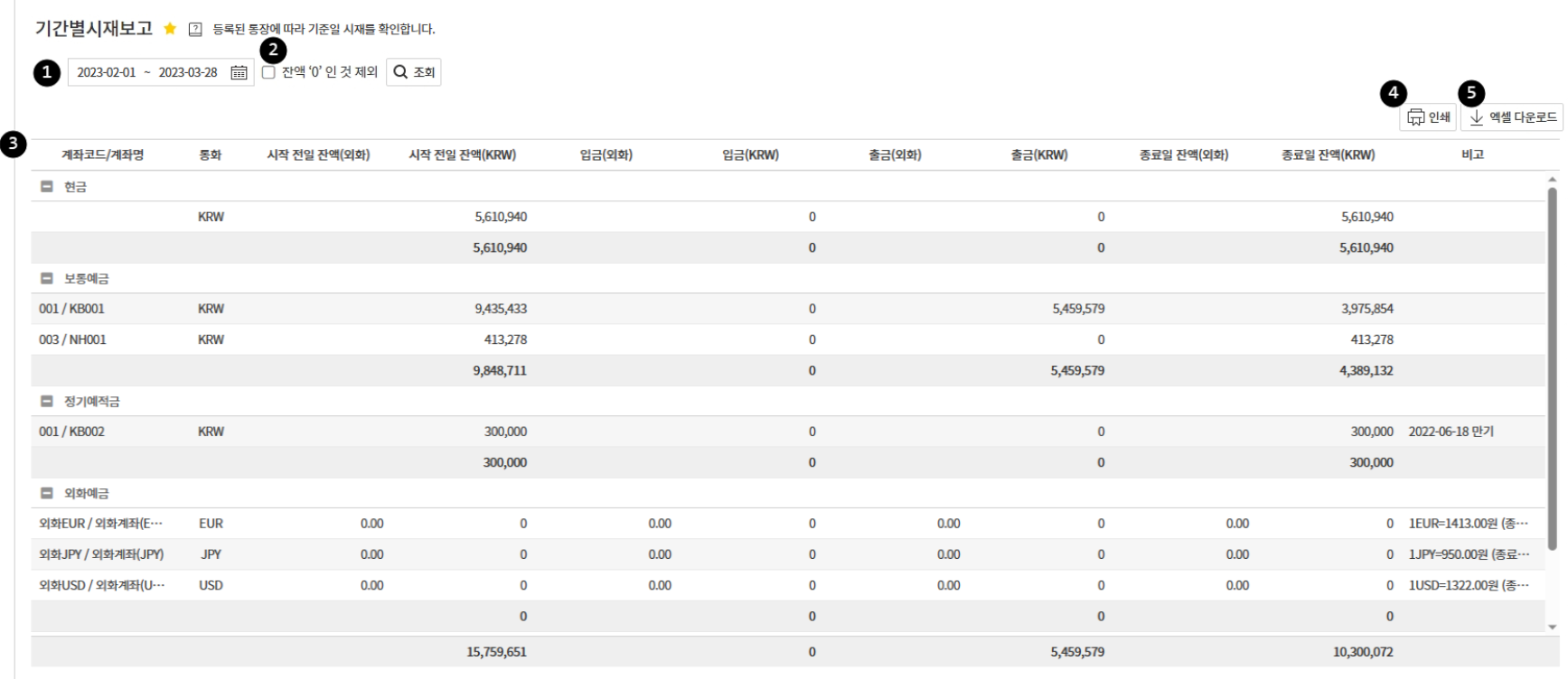 - 기간시재조회 : 선택한 기간의 유형별 입금/출금/잔액 목록과 합계금액 노출