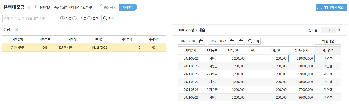 - 통장 등록 시 은행대출금으로 등록한 계좌 조회 📑[설정/연동] 통장/카드 등록 가이드 참고